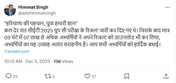 हरियाणा कर्मचारी चयन आयोग (HSSC) ने हरियाणा CET ग्रुप C रिजल्ट 2025 जारी कर दिया है। लंबे समय से इंतजार कर रहे उम्मीदवारों के लिए यह एक बहुत खबर है। परिणाम अब आधिकारिक वेबसाइट hssc.gov.in और cet2025groupc.hryssc.com पर उपलब्ध है। उम्मीदवार जिसने हरियाणा सीईटी ग्रुप सी परीक्षा दी थी, वे अब अपना एचएसएससी सीईटी ग्रुप सी रिजल्ट और स्कोर कार्ड डाउनलोड कर सकते हैं।